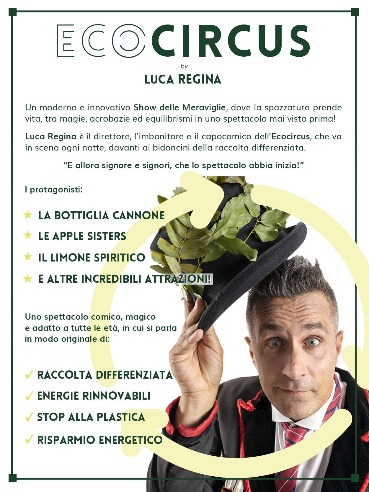 EcoCircus je zelena komedija talijanskog, međunarodno poznatog umjetnika Luce Regine, klauna, iluzionista, komičara i zabavljača. Riječ je o modernoj, uzbudljivoj i inovativnoj predstavi u kojoj kroz magiju, akrobacije i balansiranje Luca Regina otpad oživljava i on postaje protagonist akrobatskih gegova, iznenađujućih prikaza i nevjerojatnih performansa. Ova komična, magična predstava prikladna je za sve uzraste, u kroz nju Regina na originalan način govori o odvojenom prikupljanju otpada, obnovljivim izvorima energije i uštedi energije. EcoCircus je predstava koja zabavlja, a istovremeno potvrđuje bitnu potrebu za većom sviješću o ekološkim problemima, počevši od nas samih.